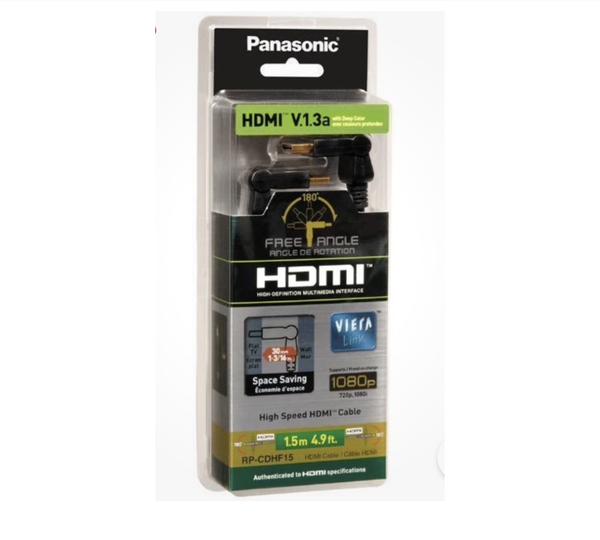 The Panasonic RP-CDHF15 is a 1.5-metre High-Speed HDMI cable designed with a 180° Free Angle (rotating) connector that makes connecting HDMI devices easier when space behind a screen is limited — especially useful for wall-mounted TVs or shallow entertainment units